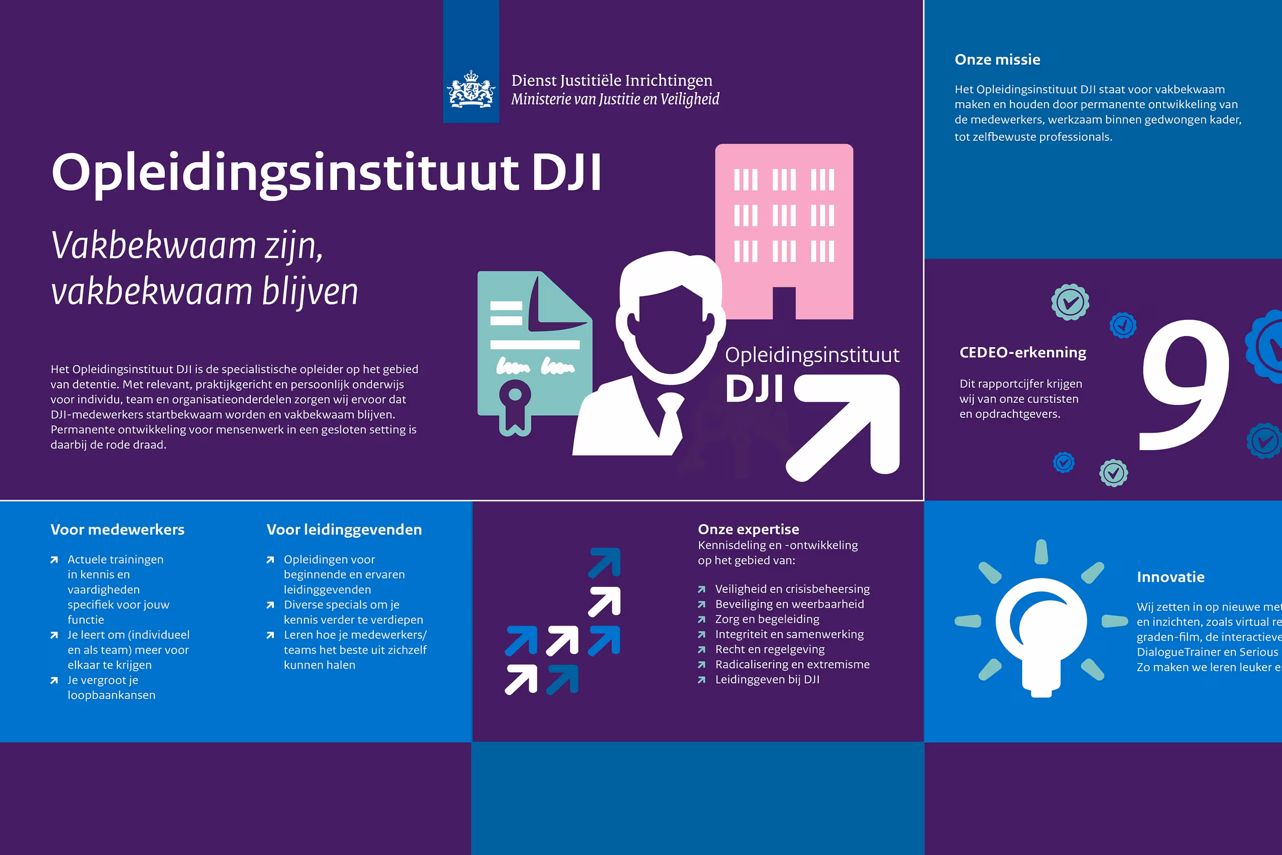 Het Opleidingsinstituut Dienst Justitiële Inrichtingen (DJI) is de specialistische opleider voor zowel DJI als betrokken ketenpartners. Wij bieden relevant en praktijkgericht onderwijs voor medewerkers en leidinggevenden. Zo kunnen zij als vakbekwame professionals samen met justitiabelen werken aan een veilige terugkeer naar de maatschappij.